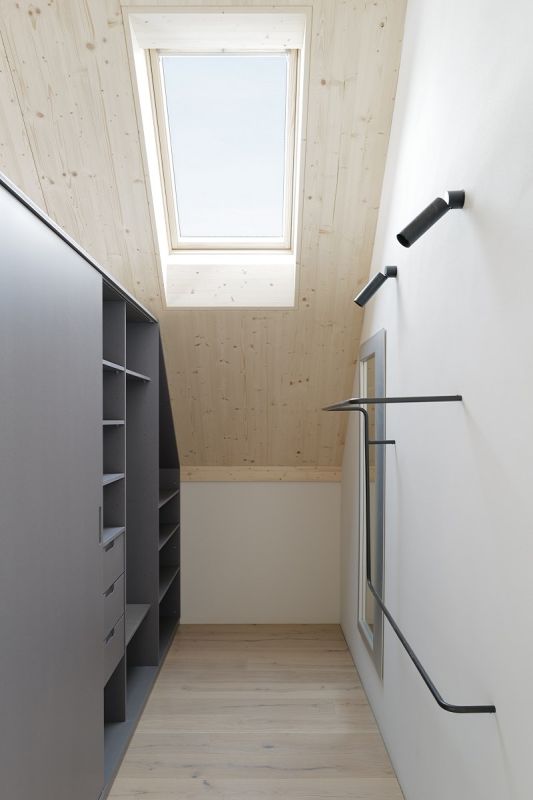 Das kubische Haus wächst aus dem Strassengeschoss in die Höhe wie ein Monolith. Die Parzelle am Solenberg weist eine grosse Hangneigung auf und gibt den Blick bis zum Zürichsee und in die Glarner Alpen frei. Eine Wegführung mit geradläufigen Treppen führt vom Strassengeschoss bis unter das Dachgeschoss. Die Verkleidung in Aluminium-Wellblech spielt mit der Weichheit einer Welle und der Rohheit des Materials. Die eingezogenen Nischen weisen verputzte Oberflächen auf. Zudem bilden die hellen Fenstereinfassungen einen farblichen Kontrast. Das klassische Satteldach hat eine asymmetrische Dachneigung, diese markiert den Überhohen Wohnraum mit fliessender Verbindung zum Dachgeschoss. Das Innere ist geprägt von abgestuften Farbkombinationen in harmonischen Farbtönen.